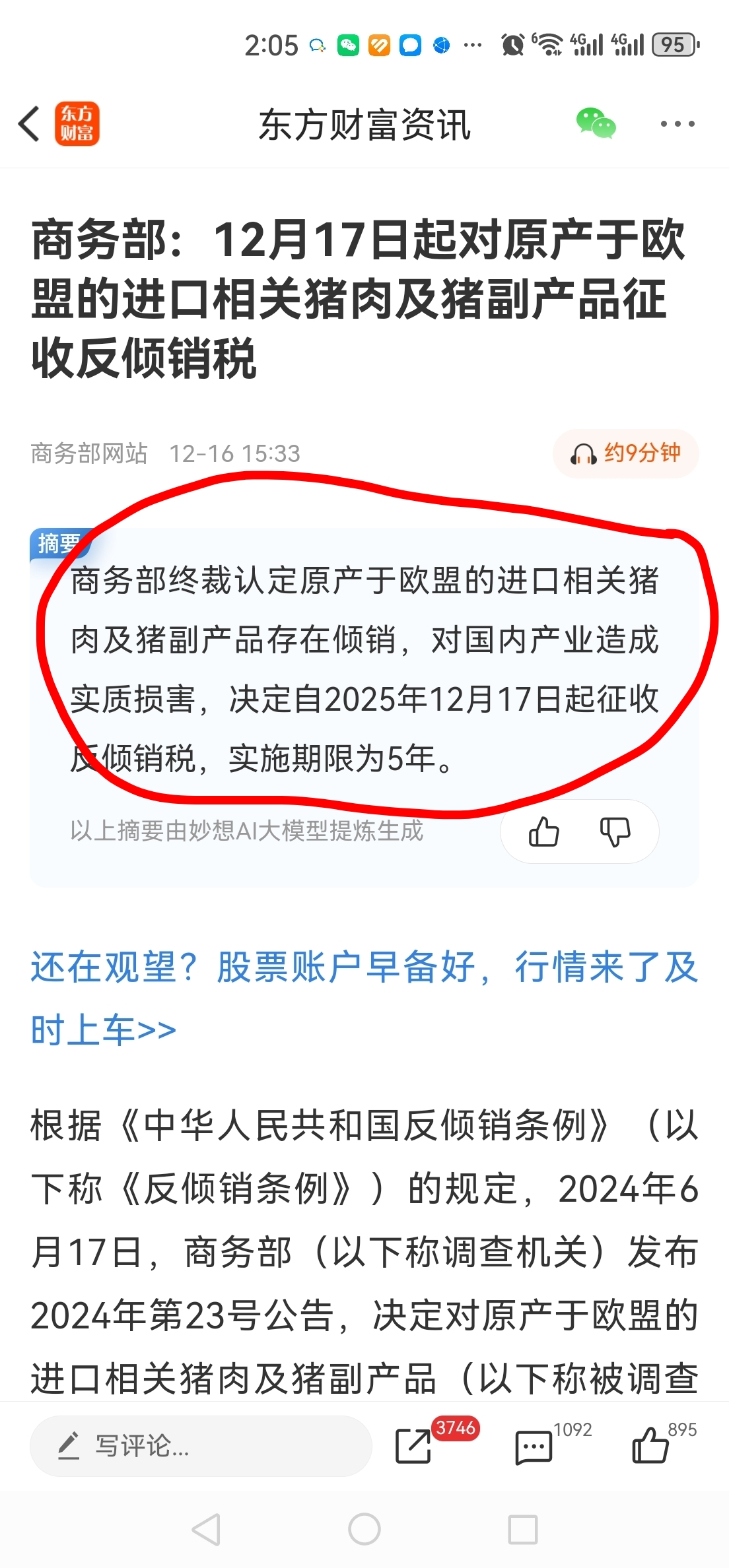 商务部终裁:12月17日对欧盟猪肉及猪副产品征收为期5年的反倾销税。