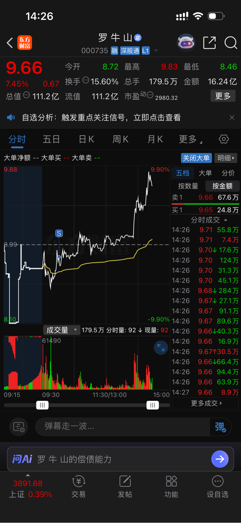 $罗 牛 山(SZ000735)$ 哦耶!又听信弹幕跟评论痛失十个点