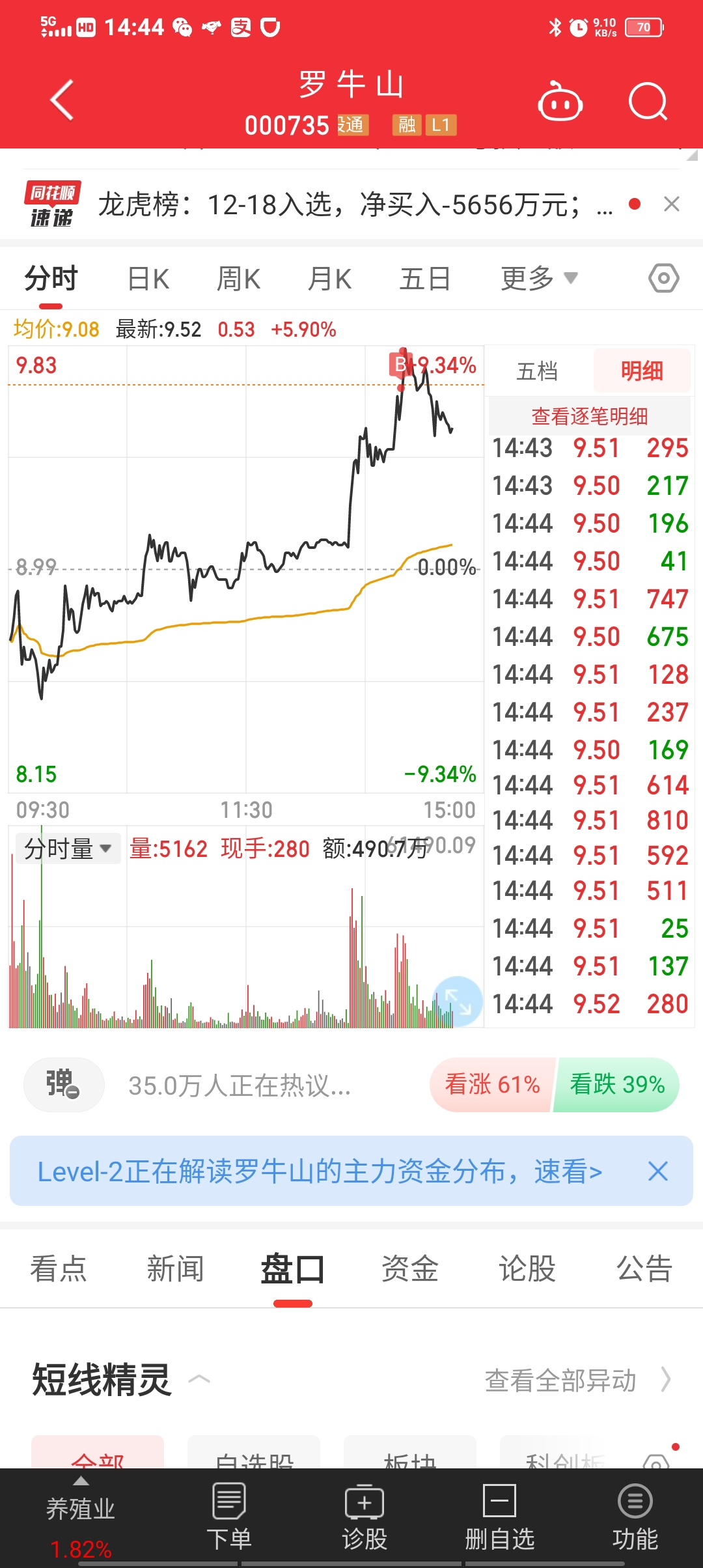 $罗 牛 山(SZ000735)$ 周一最高点买的罗牛山和海马,吃了二个半跌停,昨天地板割肉,今天又最高点追,钱就这么没了....,本来拉到9块想买回一些,犹豫一下就拉起来了。想着今天能红,结果又绿了