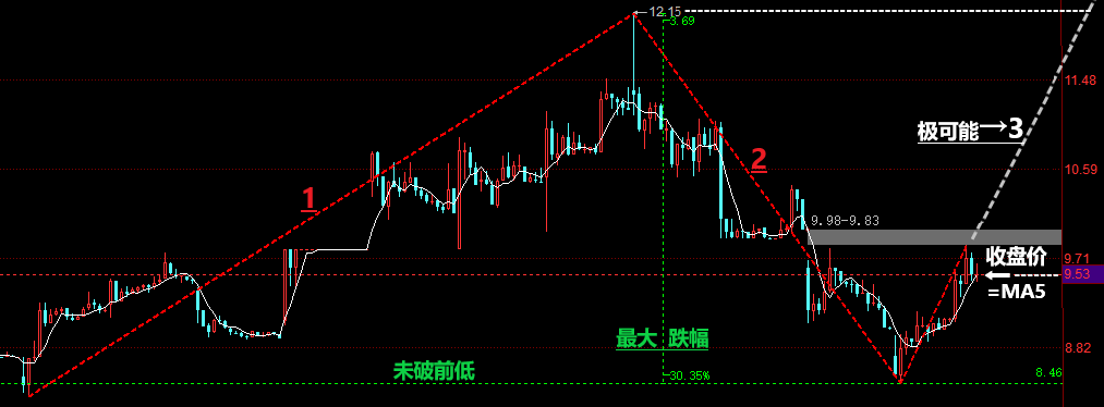 站在日线稍作溯源,即见现状并未破位,高点也不一定是屋顶,