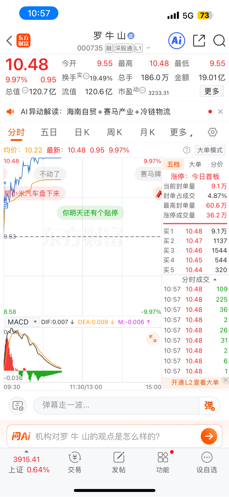 $罗 牛 山(SZ000735)$ 七个点卖了,可惜可惜,祝车上的朋友继续吃肉!