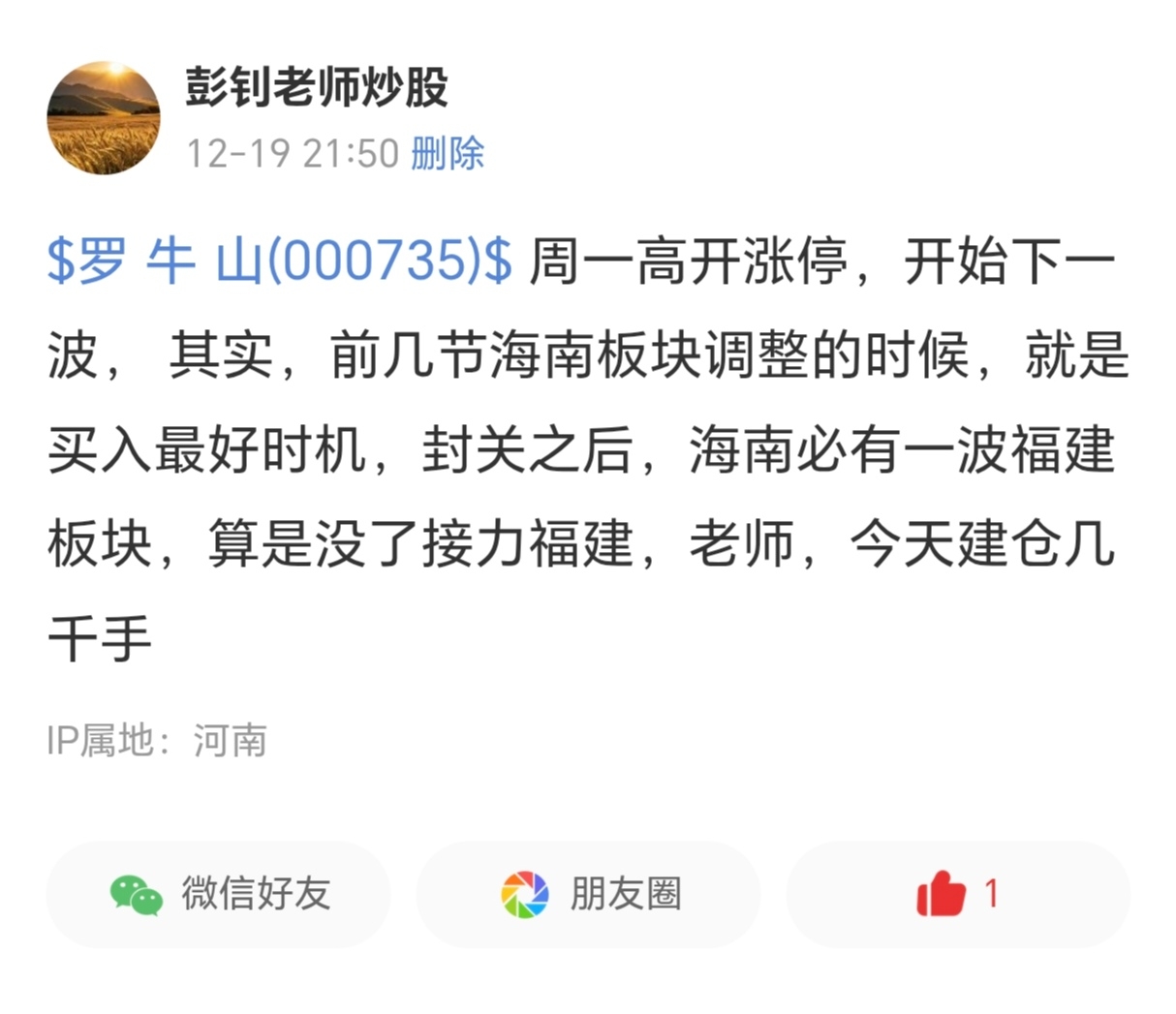 $罗 牛 山(SZ000735)$ 上个星期五我就说了,当时很多空勾就来骂我,我跟你说海南板块就是下个主线,罗牛山必定会晋级到最后成为龙头
