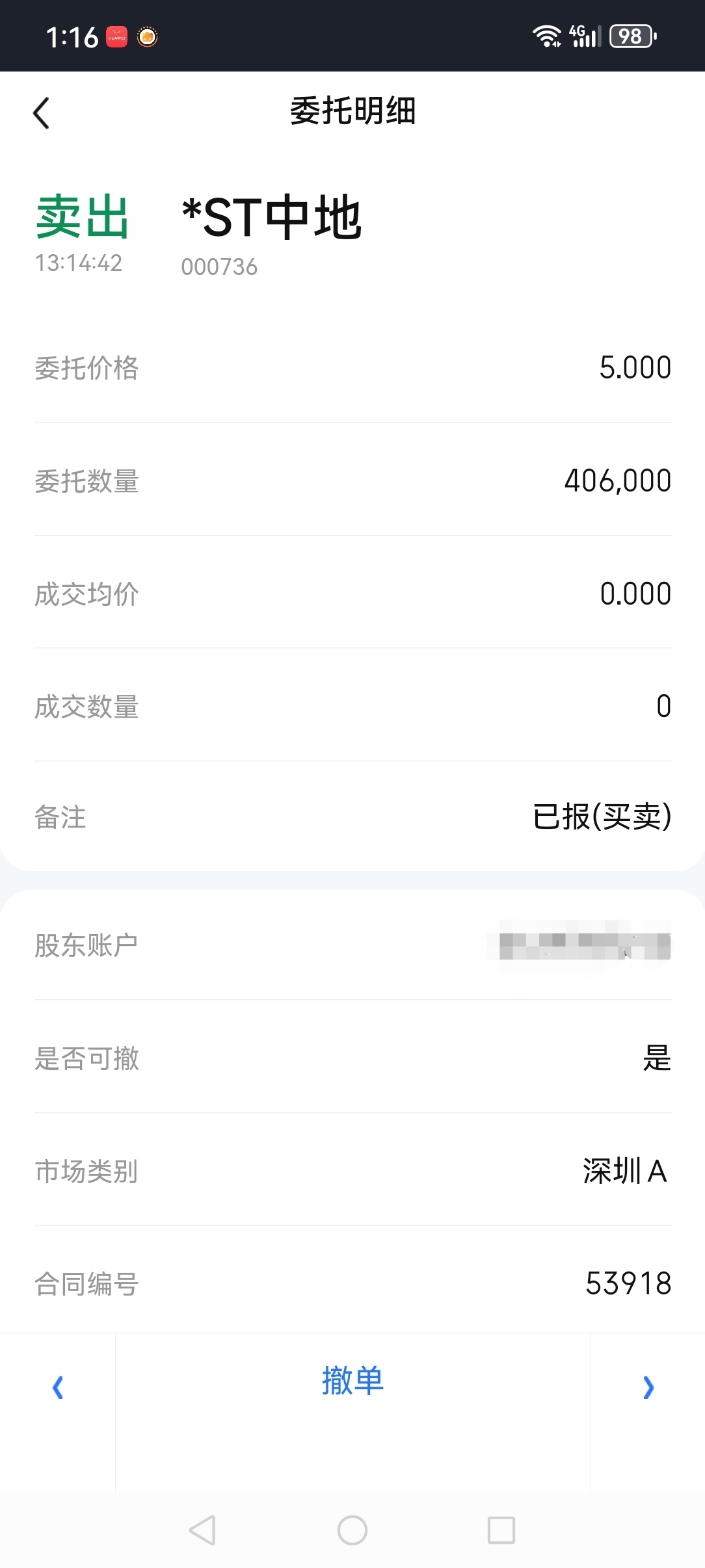 $*ST中地(SZ000736)$ 有人私信我:说我没有持有中地一手。已委托5块。10分钟后撤单,股价如果接近我委托的5块也会立刻撤单。