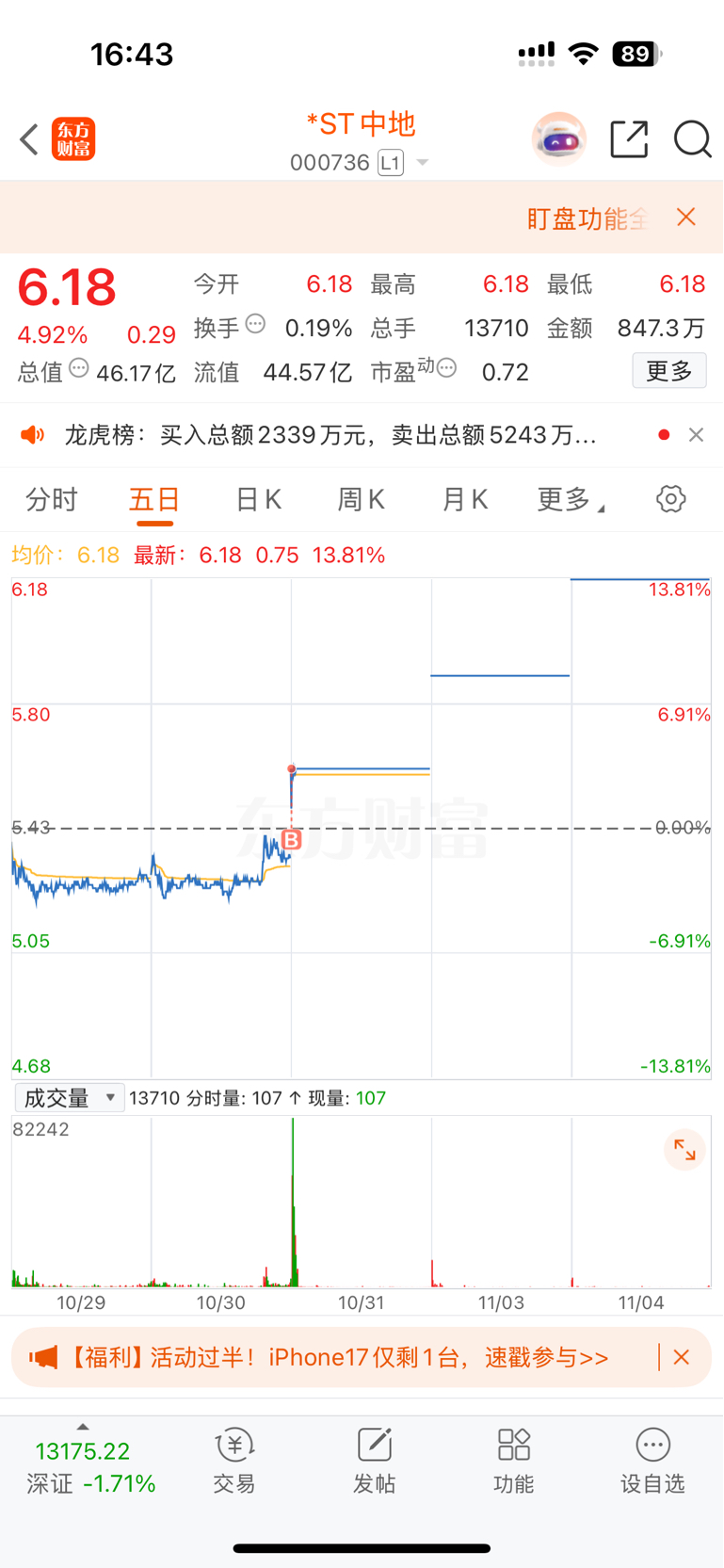 $*ST中地(SZ000736)$ 买少了,一天一顿火锅钱也很不错了...