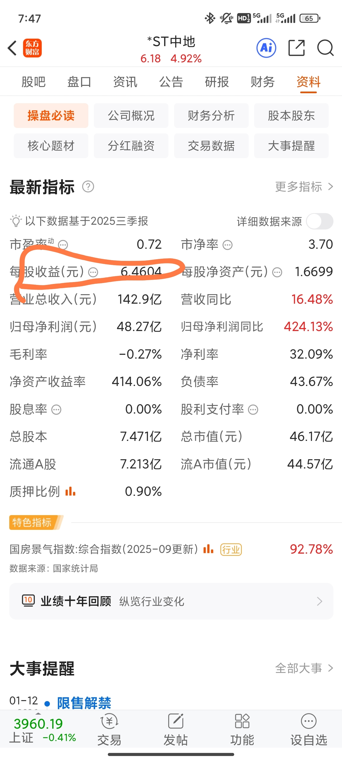 资产剥离后,中地每股收益6.4604元,收益比股价还高,难得的机会,天降的富贵啊