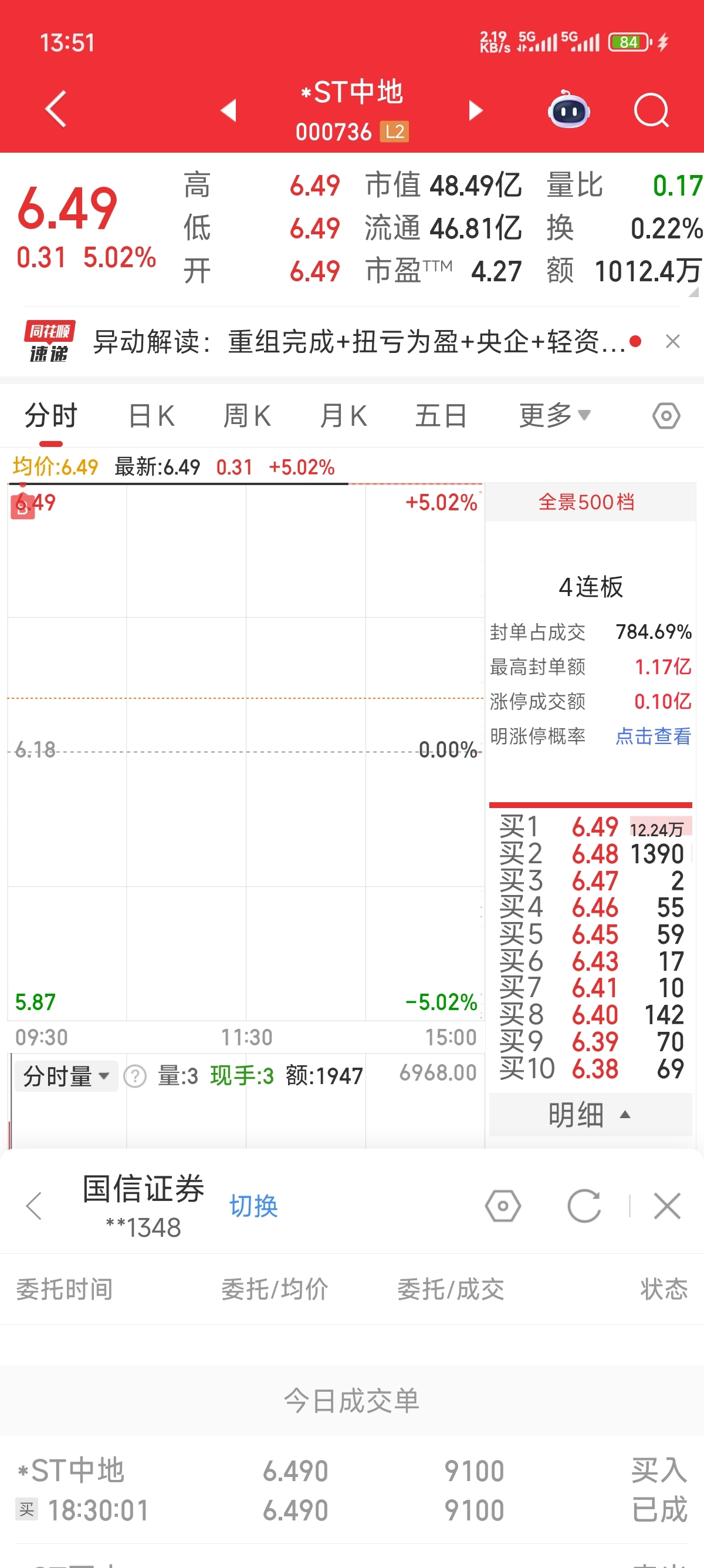 $*ST中地(SZ000736)$ 每天早点挂单还是有机会的,不要放弃,加油!共勉