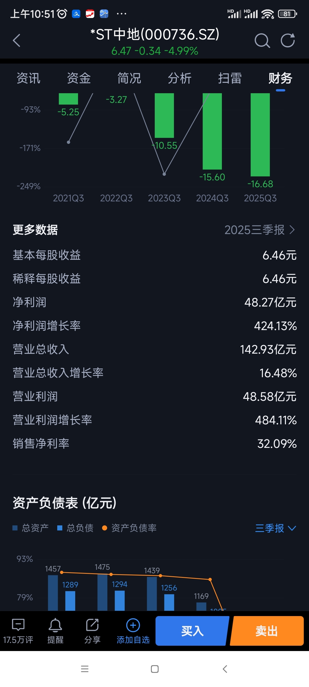 $*ST中地(SZ000736)$ 净利润48亿股价也48亿?