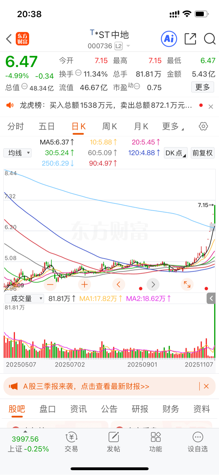 $*ST中地(SZ000736)$ 看成交量,好像一天就释放了绝大多数的获利盘,远古巨量,真的太夸张了,但是至少四分之三的仓位是在6.6元以下成交的。虽然卖了,但只是为了保护利润,不想再赌,觉得应该不会深度调整,真给机会还会再接一部分。