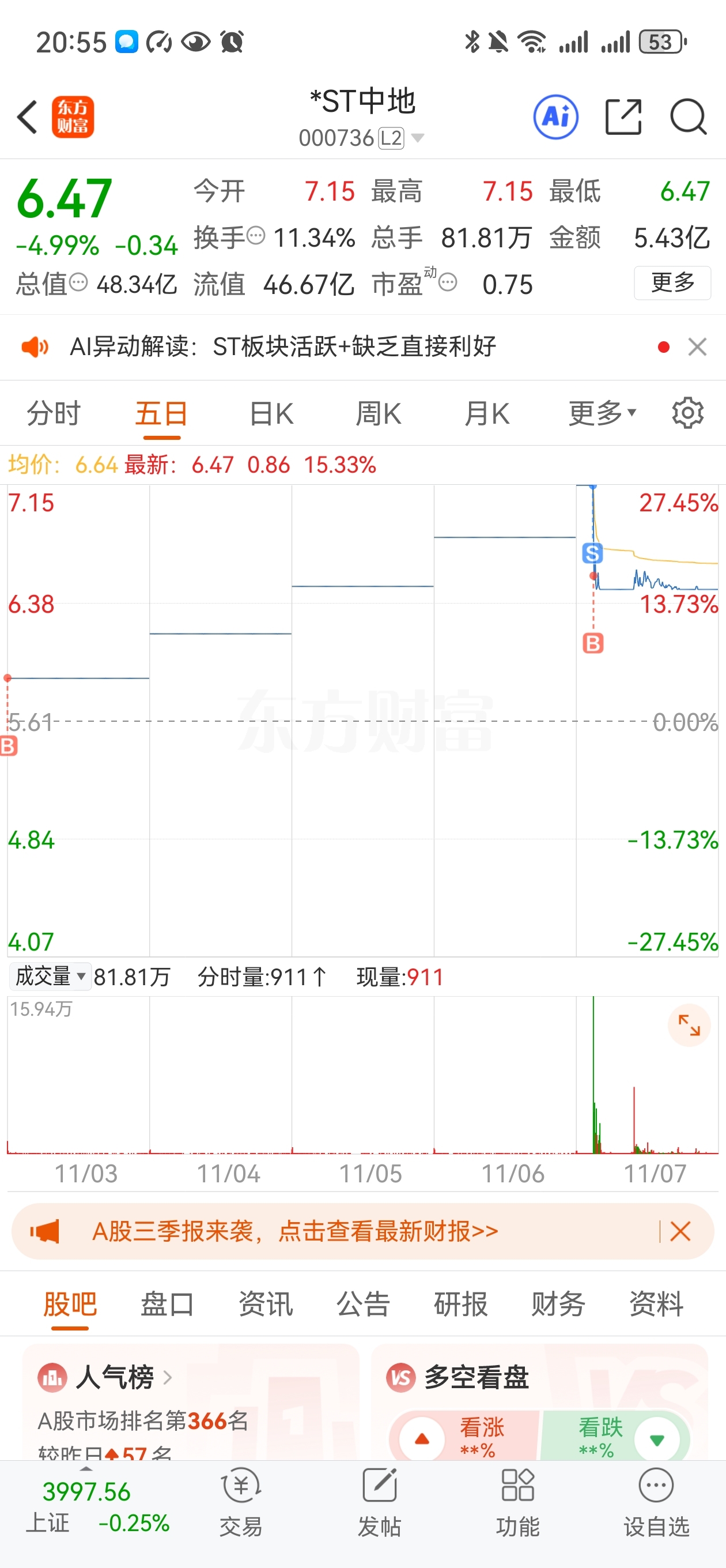 $*ST中地(SZ000736)$ 有利润,敢绿色我就敢加