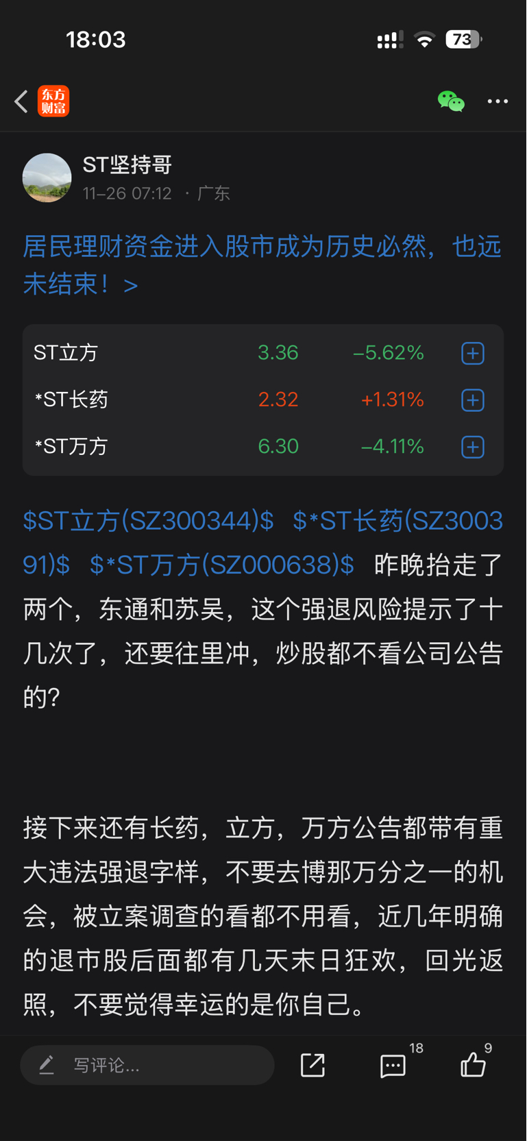 $*ST中地(SZ000736)$ $*ST长药(SZ300391)$ $*ST万方(SZ000638)$ 立方今晚抬走了,下一个就是长药,万方,带有重大违法字眼的千万不要去博