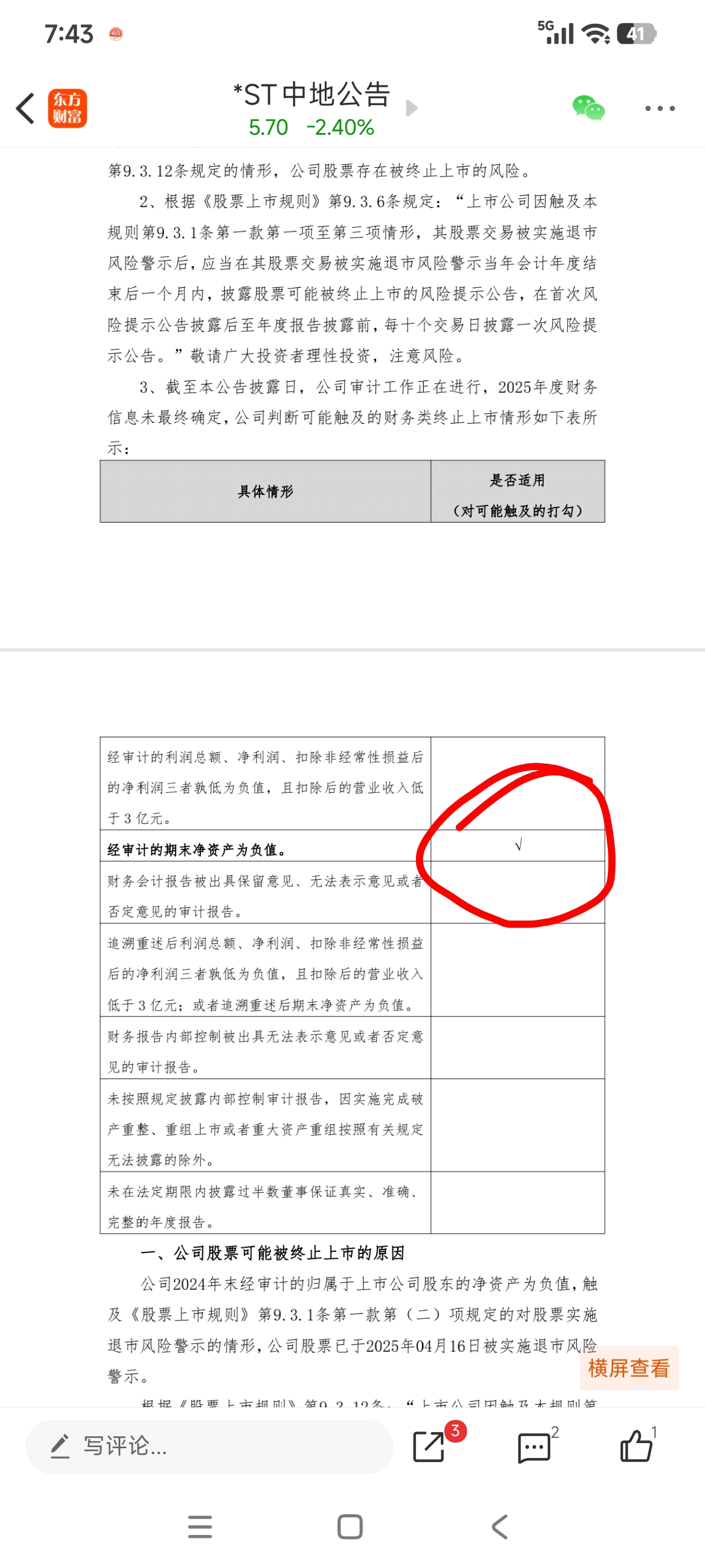 这是中地退市的唯一要求,但是净资产有12.5亿,所以明年摘帽