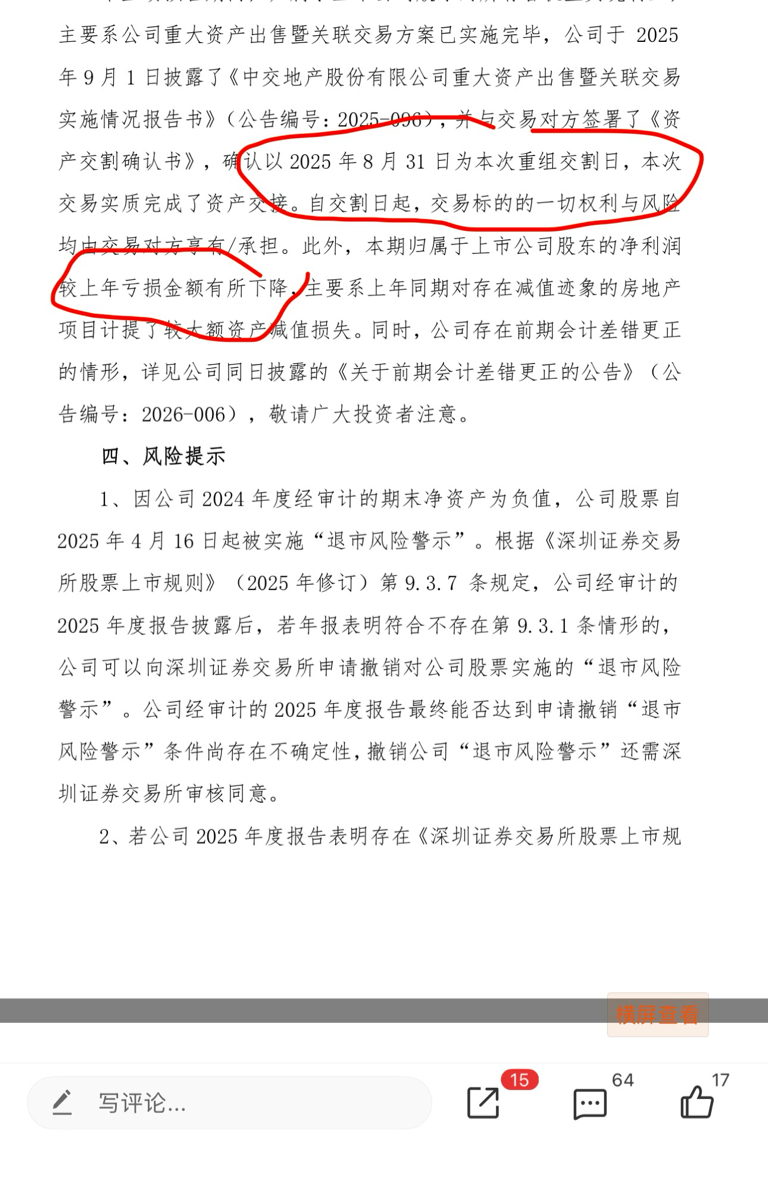 $*ST中地(SZ000736)$ 9月份开始,地产的业务不在是中地的!属于母公司!那么今年四月份年报应该好看!不管咋样!跌停就买点,一点点建仓!