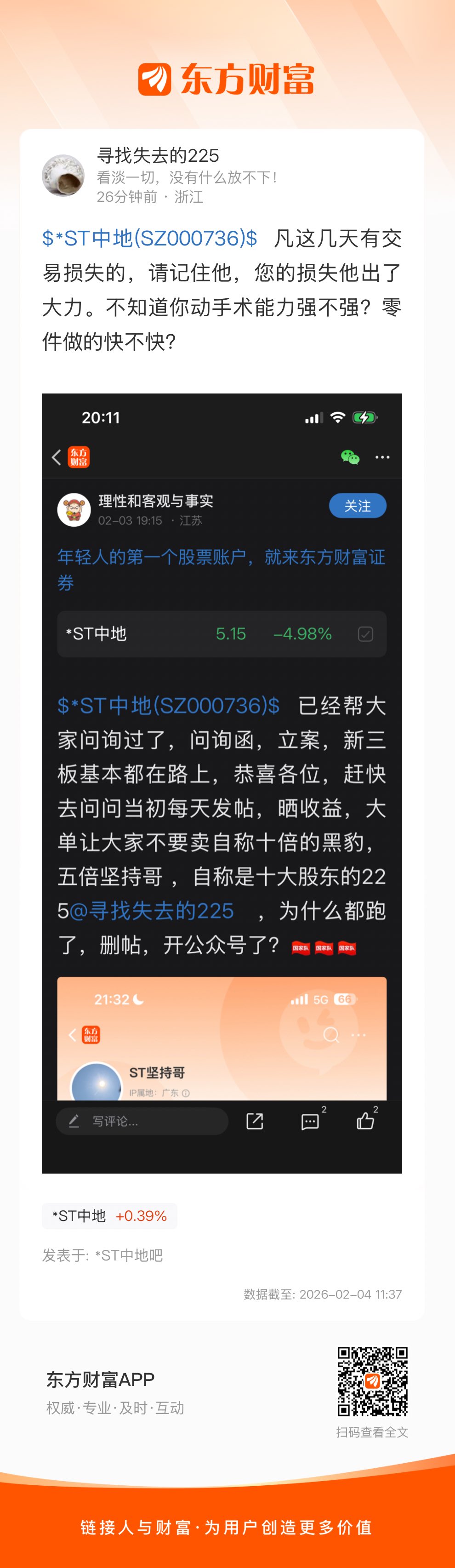 $*ST中地(SZ000736)$ 凡这几天有交易损失的,请记住他,您的损失他出了大力。不知道你动手术能力强不强?零件做的快不快?