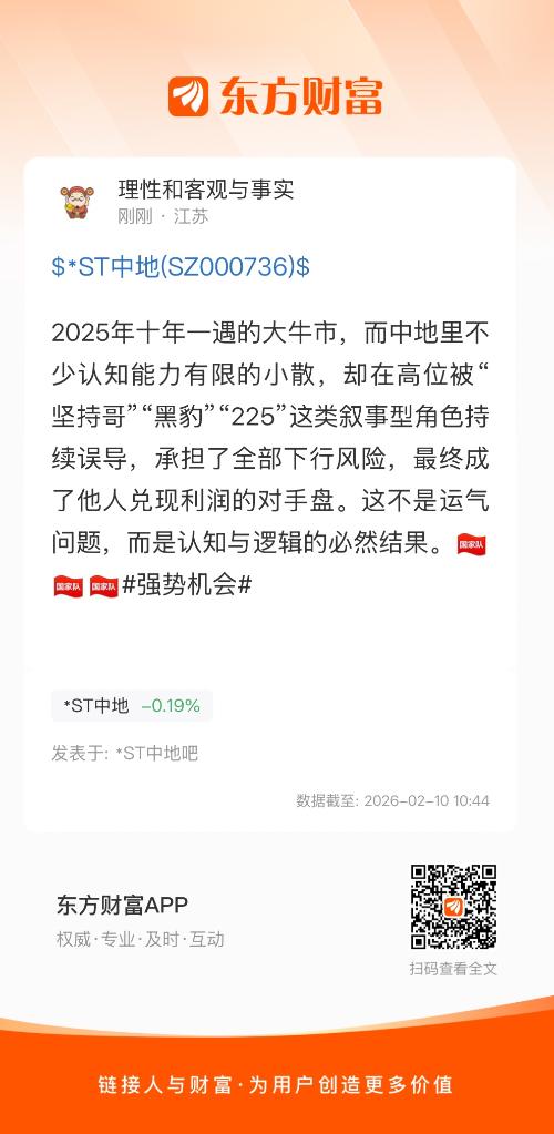 过年了,市场开始反复讨论 25 年“十年难遇的大牛市”。真正值得反思的,不是指数涨不涨,而是谁还被困在错误标的和错误叙事里。回头看中地这只票,一部分小散的结局,其实早就写好了。他们有几个高度一致的特征:账户体量小、风险承受能力弱、对财务与交易逻辑缺乏基本理解,却极度依赖“故事”“口号”和“人设”。于是你会看到——在高位阶段,反复有人出来喊:“坚持”“五倍”“全仓一支”“陪大家到最后”。坚持哥”“黑豹”“225”之流,提供的从来不是可验证的数据、不是现金流和资产兑现能力分析,而是情绪绑定 + 立场绑架。结果是什么? 下行风险由小散完整承担 流动性兑现权掌握在先行者手里 最终获利了结的,永远不是喊口号的人当真正该做的,是在牛市前夜降低无效仓位、调仓到确定性赛道时,他们却被困在中地里,一边深套,一边给自己找“长期价值”的心理安慰。这不是市场残忍,而是认知不足、逻辑缺失,必然走向的结局。牛市不会拯救错误的认知,只会放大差距。到最后你会发现:不是他们没赶上牛市,而是他们在牛市来之前,就已经把自己变成了别人获利了结的对手盘。