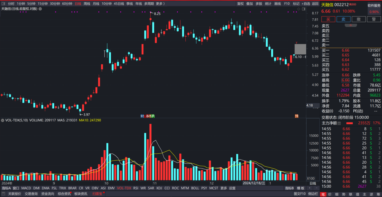 天融信:软件开发板块,公司是中国领先的网络安全、大数据与云服务提供商。昨天一字涨停,主要是因为消息面的利好,1月15日发布业绩预报,公司预计2024年扭亏,净利润同比增长117.50%至124.23%。并且,英伟达和微软最近都在宣布“量子科技”的相关项目,美股量子计算板块周三全线飙升。而公司通过全资孙公司参股安徽问天量子科技股份有限公司,是我国首批从事量子信息技术产业化的高新技术企业,同时也是密标委指定的量子密码标准制订工作组牵头单位,因此有一定的想象空间。该谷压力在7.6附近,突破之后后市可能是一马平川。