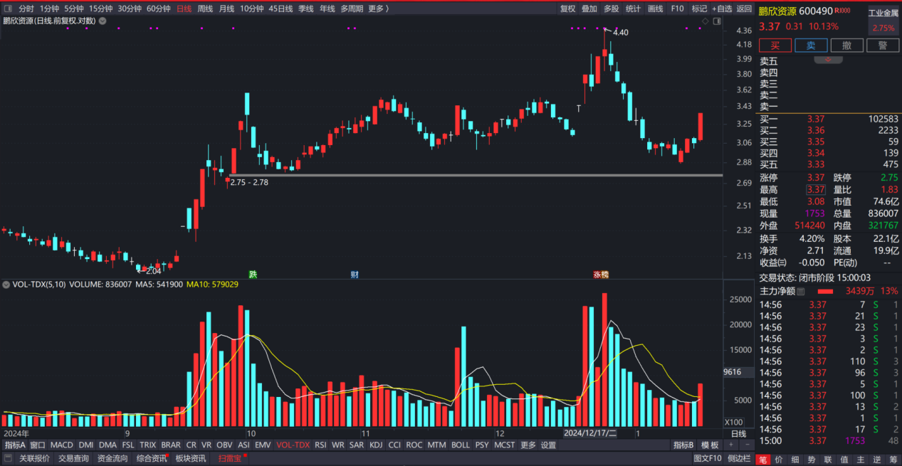 鹏欣资源:公司是工业金属板块的,以铜、金、钴、铝等金属为主的领先的综合资源服务商。昨天底部反转,放量涨停,是趋势反转的信号。基本面来看,公司在全球范围内从事黄金、铜、钴及其他金属矿产资源的勘探、开采、冶炼加工及相关产品销售业务,开展与金属矿冶关联的贸易和金融等方面业务。消息面上有利好,公司计划投资5500万南非兰特用于西选厂复产项目,此次复产仅针对部分设备进行修复,不涉及更改生产工艺,有望增厚公司的业绩。技术面来看,目前上方压力是3.8附近,如果能够收复,则上升空间会打开。$鹏欣资源(SH600490)$