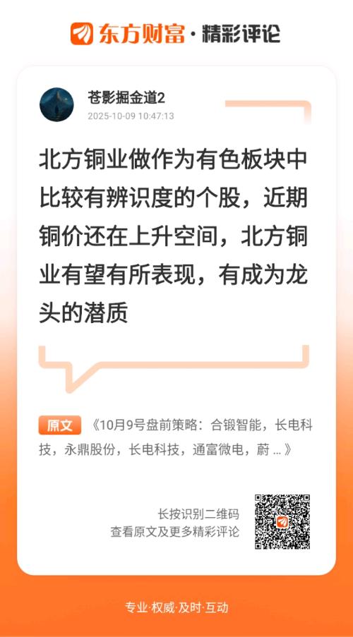 //@苍影掘金道2 :北方铜业做作为有色板块中比较有辨识度的个股,近期铜价还在上升空间,北方铜业有望有所表现,有成为龙头的潜质 $北方铜业(SZ000737)$$江西铜业(SH600362)$$合锻智能(SH603011)$