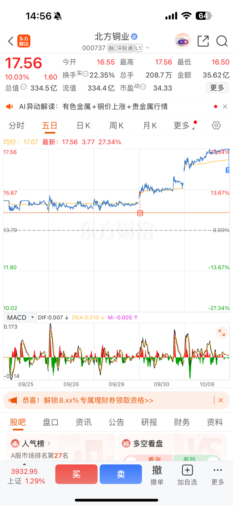 $北方铜业(SZ000737)$ 明天找机会再买回来