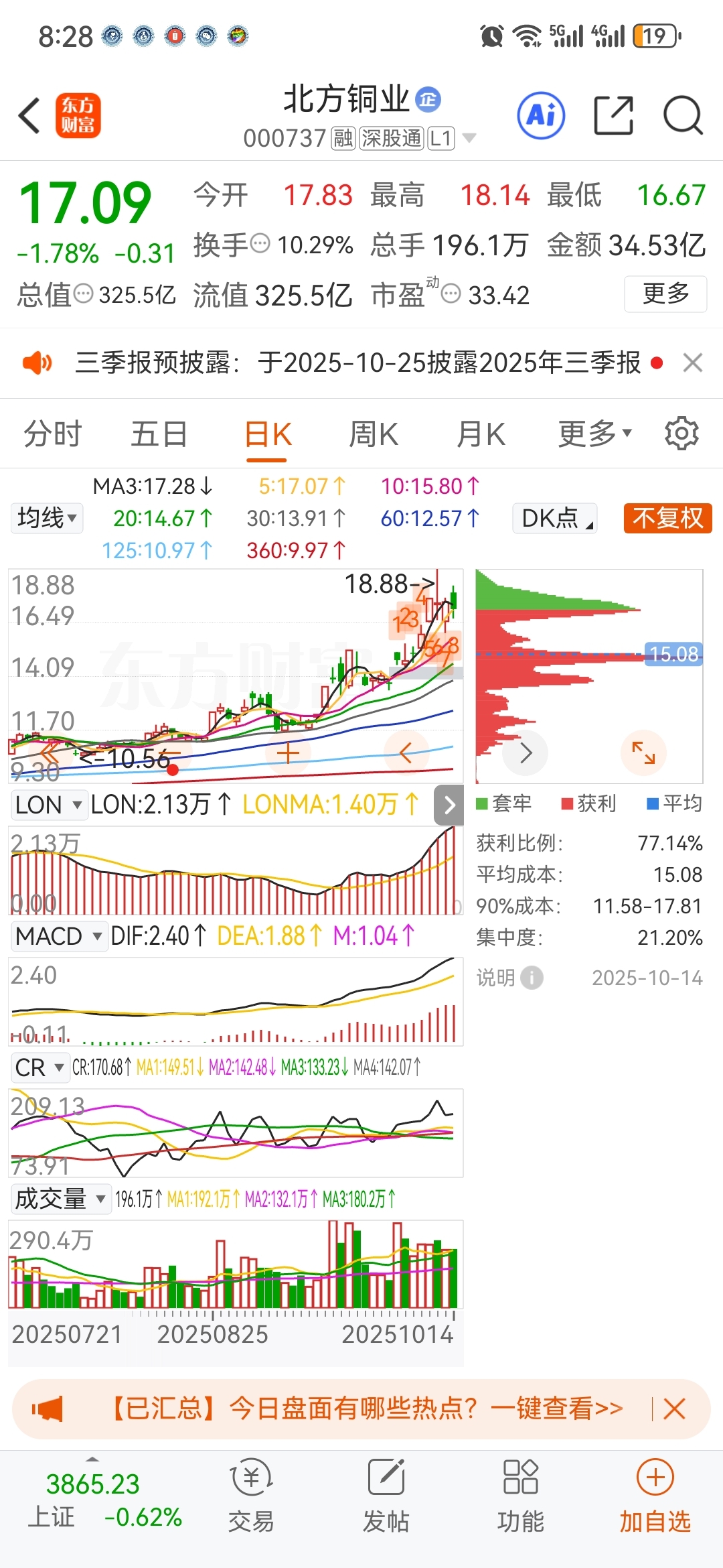 $北方铜业(SZ000737)$ 18.88数字顶,暂时出来,莫要恋战。二三天会让你输得怀疑人生,注意仓位。