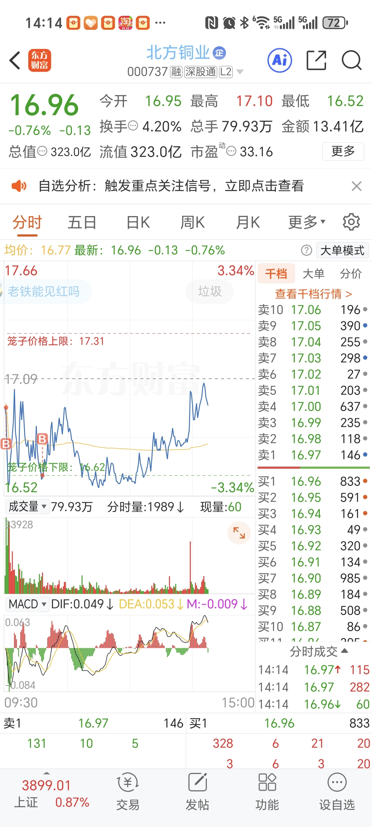 $北方铜业(SZ000737)$ 期货大涨,赌夜盘也能涨。预测今天收盘17.28上方,明天高开高走。