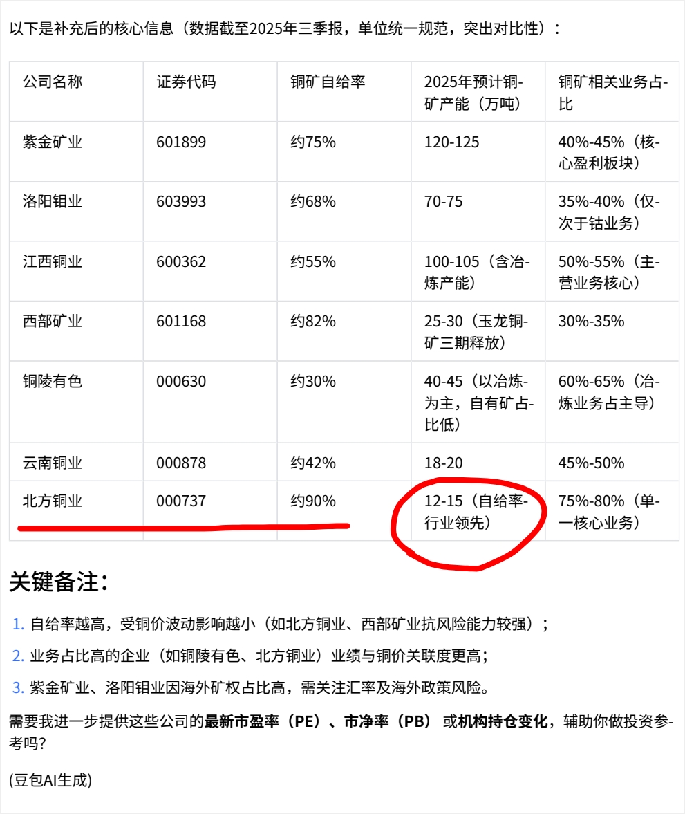 $北方铜业(SZ000737)$ 豆包这个数据准确不? 那为啥北铜这波反弹这么差,不是自有矿多涨得强吗?