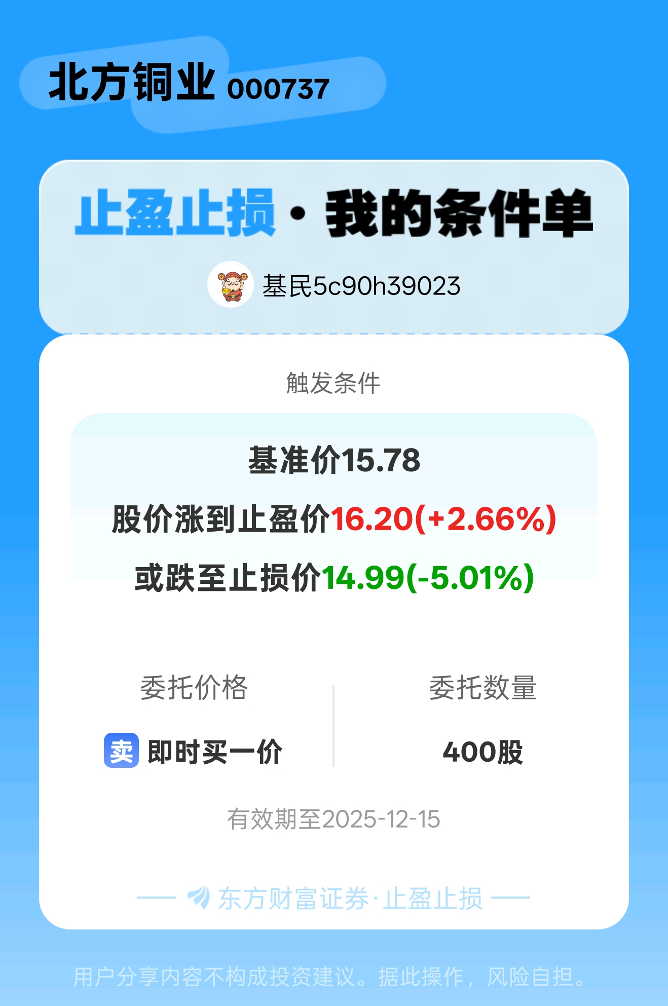 #条件单交流# #止盈止损晒单# 一位股神设置了一个止盈止损条件单,接下来就是见证奇迹的时刻~$北方铜业(SZ000737)$