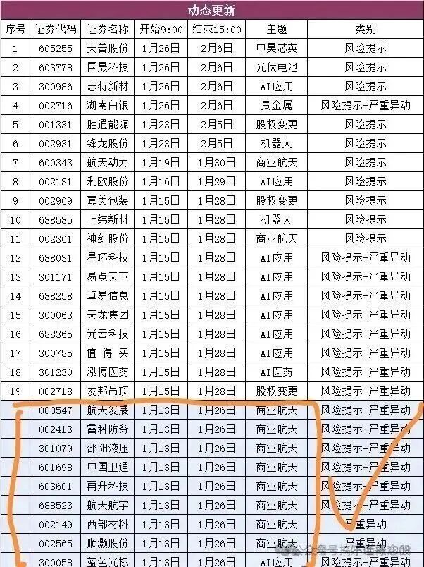 监管放松:9只严重异动股票(8家商业航天+1家AI应用)今日解除监管,且无一被再次监管;明日另有11只即将解禁。若继续无"二进宫"现象,标志着此轮强监管调整基本结束。
