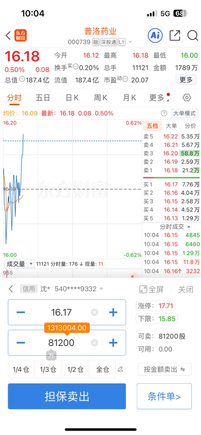$普洛药业(SZ000739)$  8万股不到20一股不减,天天给你挂跌停