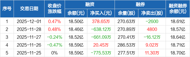 融资方面,当日融资买入3066.03万元,融资偿还2687.38万元,融资净买入378.65万元。融券方面,融券卖出3200股,融券偿还5800股,融券余量270.63万股,融券余额1147.47万元。融资融券余额合计18.61亿元。