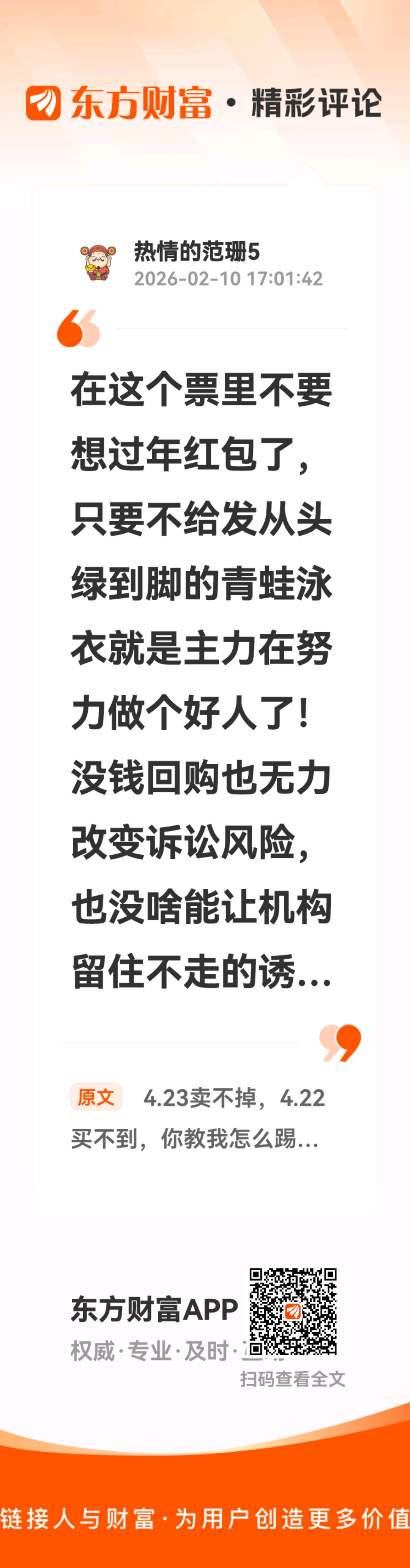 //@热情的范珊5 :在这个票里不要想过年红包了,只要不给发从头绿到脚的青蛙泳衣就是主力在努力做个好人了!没钱回购也无力改变诉讼风险,也没啥能让机构留住不走的诱饵。主力也是干瞪眼!过年哩,谁有头发甘当!
