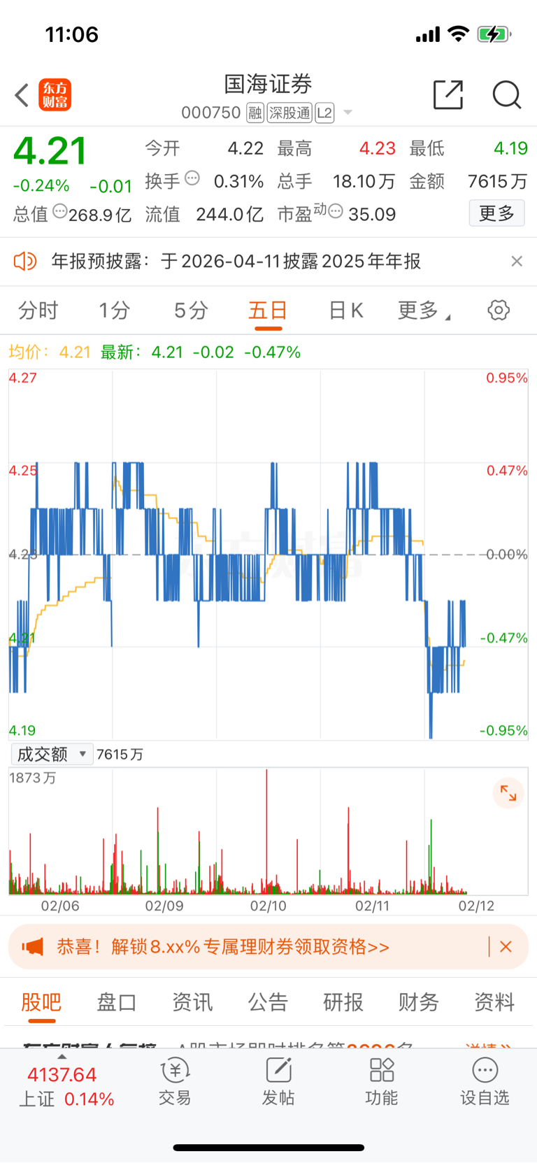$国海证券(SZ000750)$ 一周真均匀