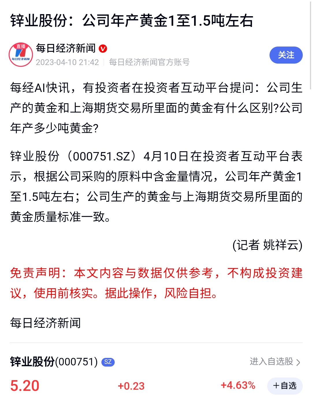 $锌业股份(SZ000751)$ 这股也算黄金股吧,为什么黄金涨它不涨呢。