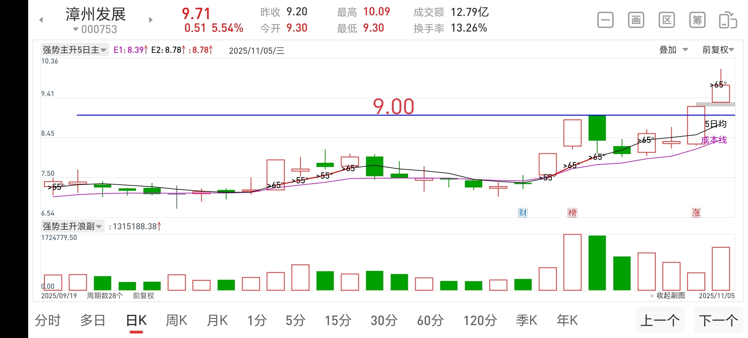 $漳州发展(SZ000753)$ 昨日以涨停突破9.00平台位,今天打出65度角上升,能否走主升行情拭目以待.