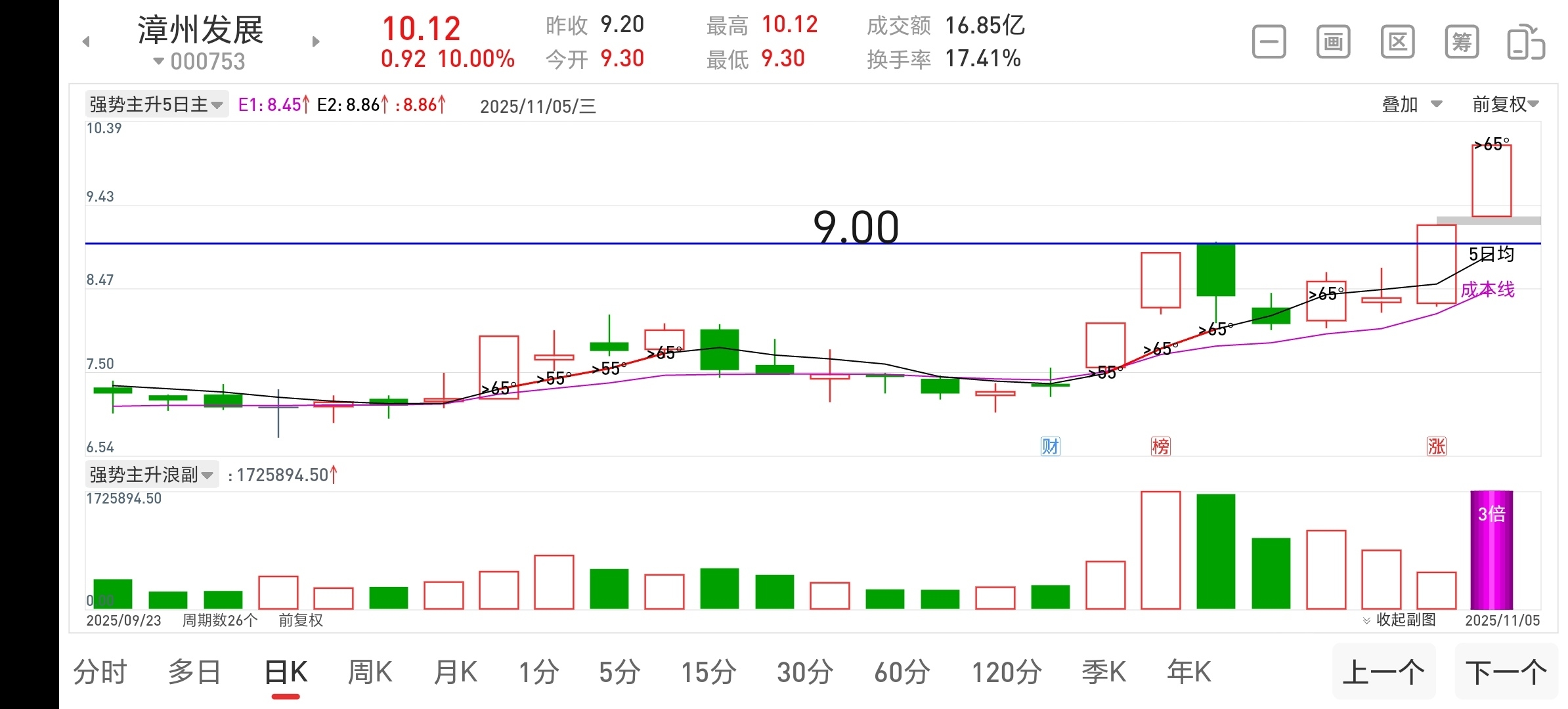 $漳州发展(SZ000753)$ 有点平潭的味道了,今天打开65度角,3倍量,涨停板突破,漂亮!