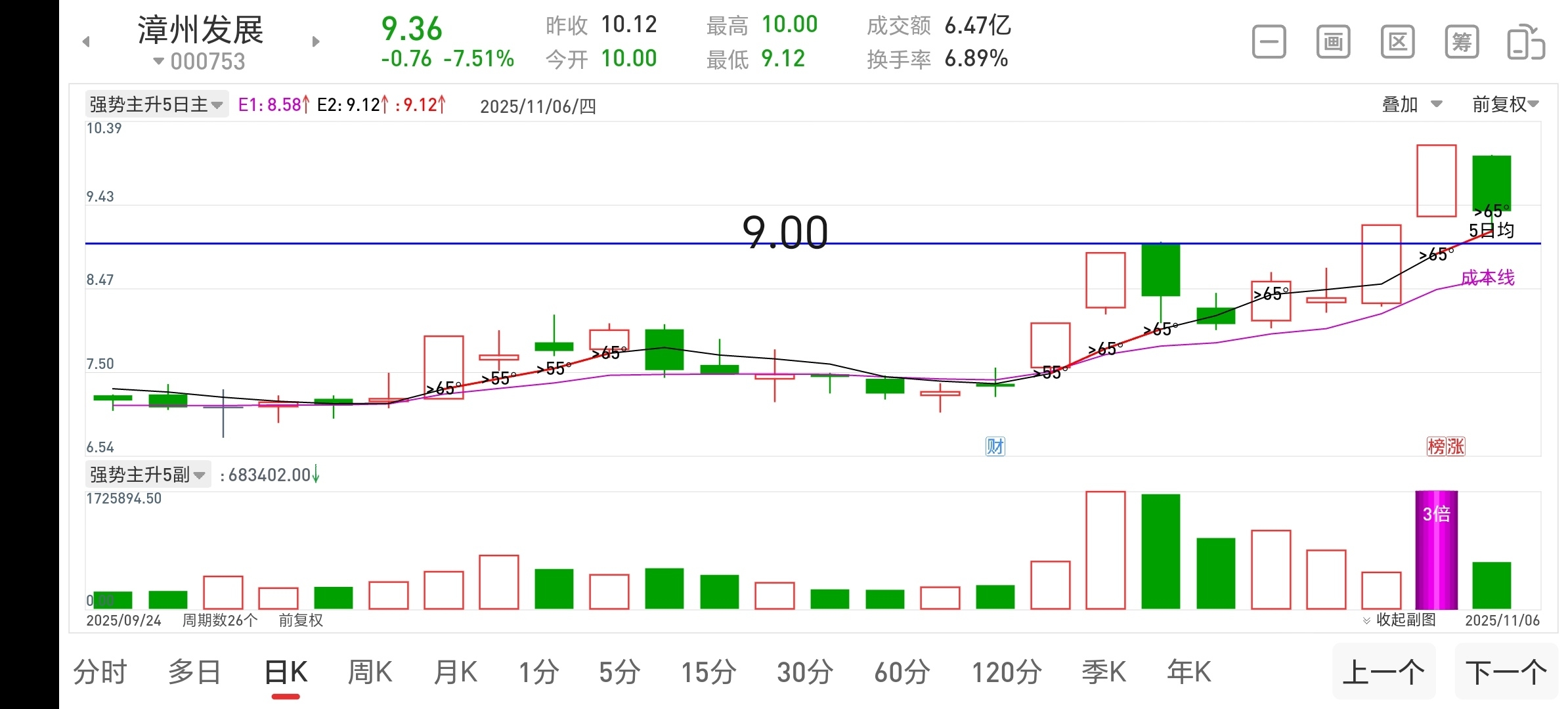 $漳州发展(SZ000753)$ 今天跌幅比较大,但是依然保持上升趋势,今天打出了第二个65度,强势并没改变,继续持股