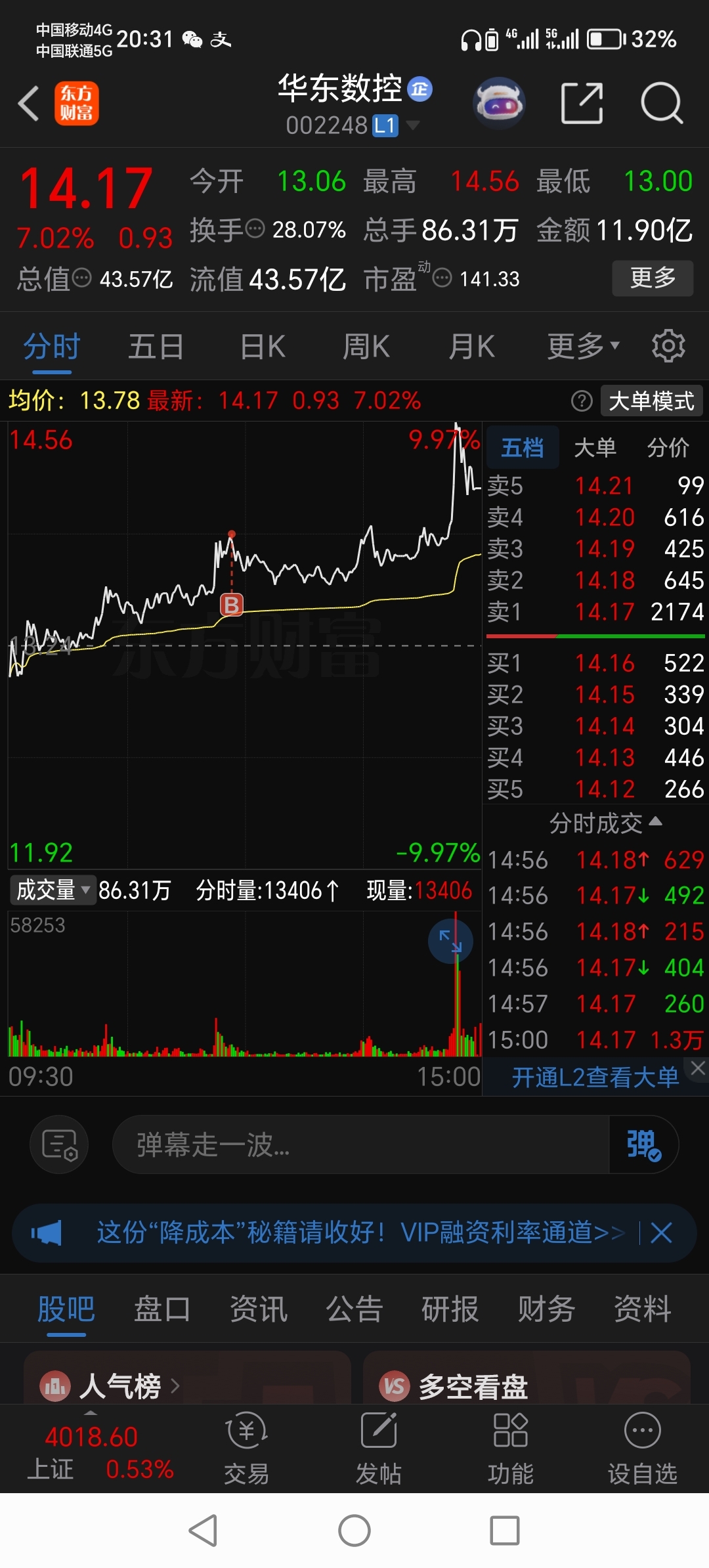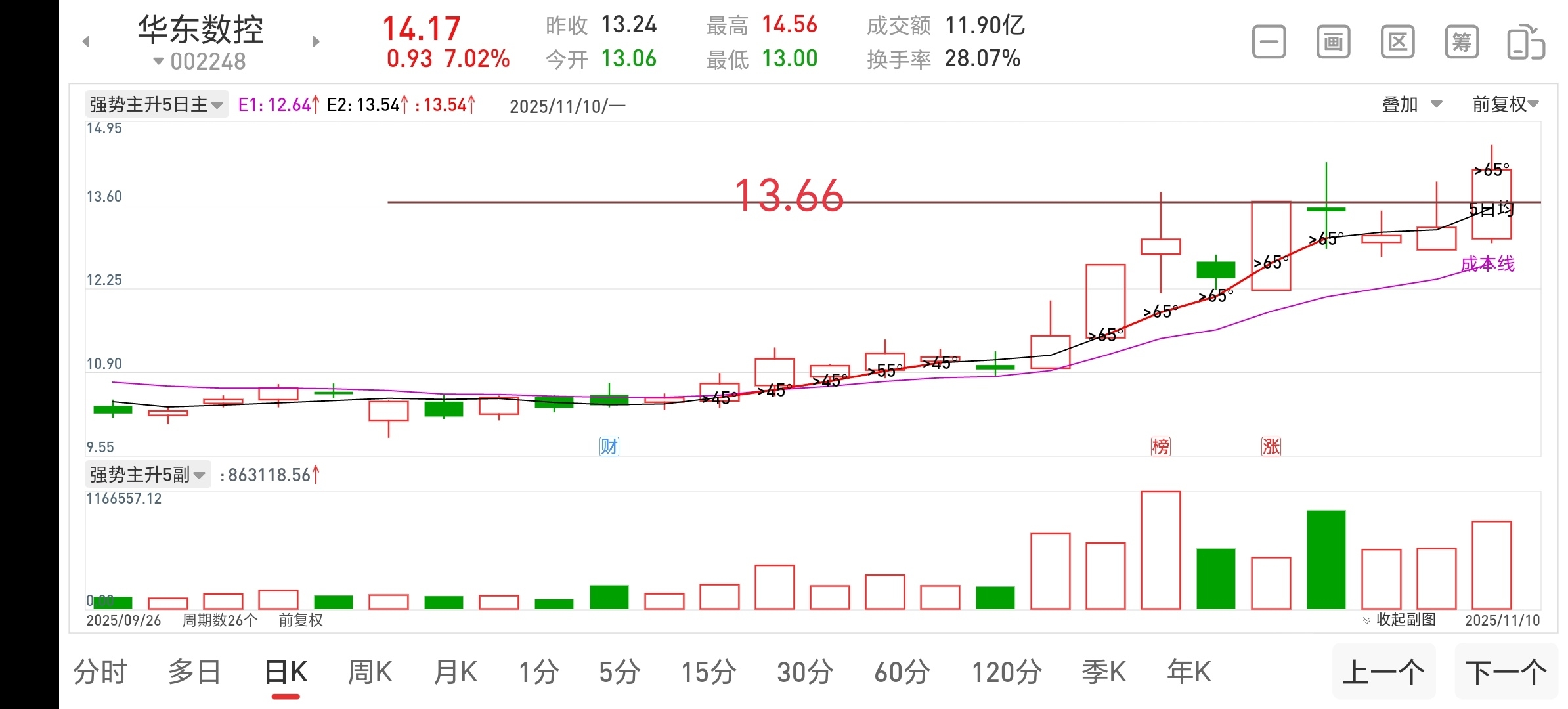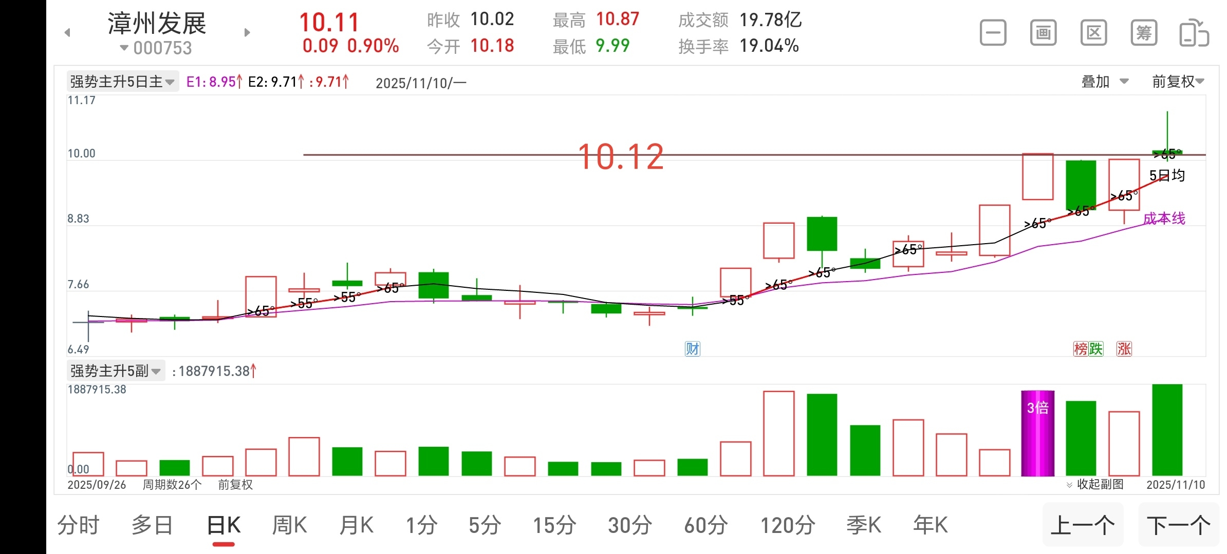 $漳州发展(SZ000753)$ 今日冲高回落,但是依然走出第4天65度角,走主升行情,强势不变故继续持股,明天5日线上移至10.06付近,走势比较关键必须走反包才能保持上攻态式,不然就会做平台整理,然后在上,趋势票就是这样,今天杀进华东数控居然一不小心差点搞个板,吃了点小肉,华东刚刚突破打出第一天65度,继续持有