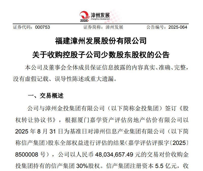 近日,漳州发展(000753)发布公告,拟收购漳州金投集团有限公司持有的漳州信息产业集团有限公司(以下简称“信产集团”)30%股权,交易金额为4803.47万元。