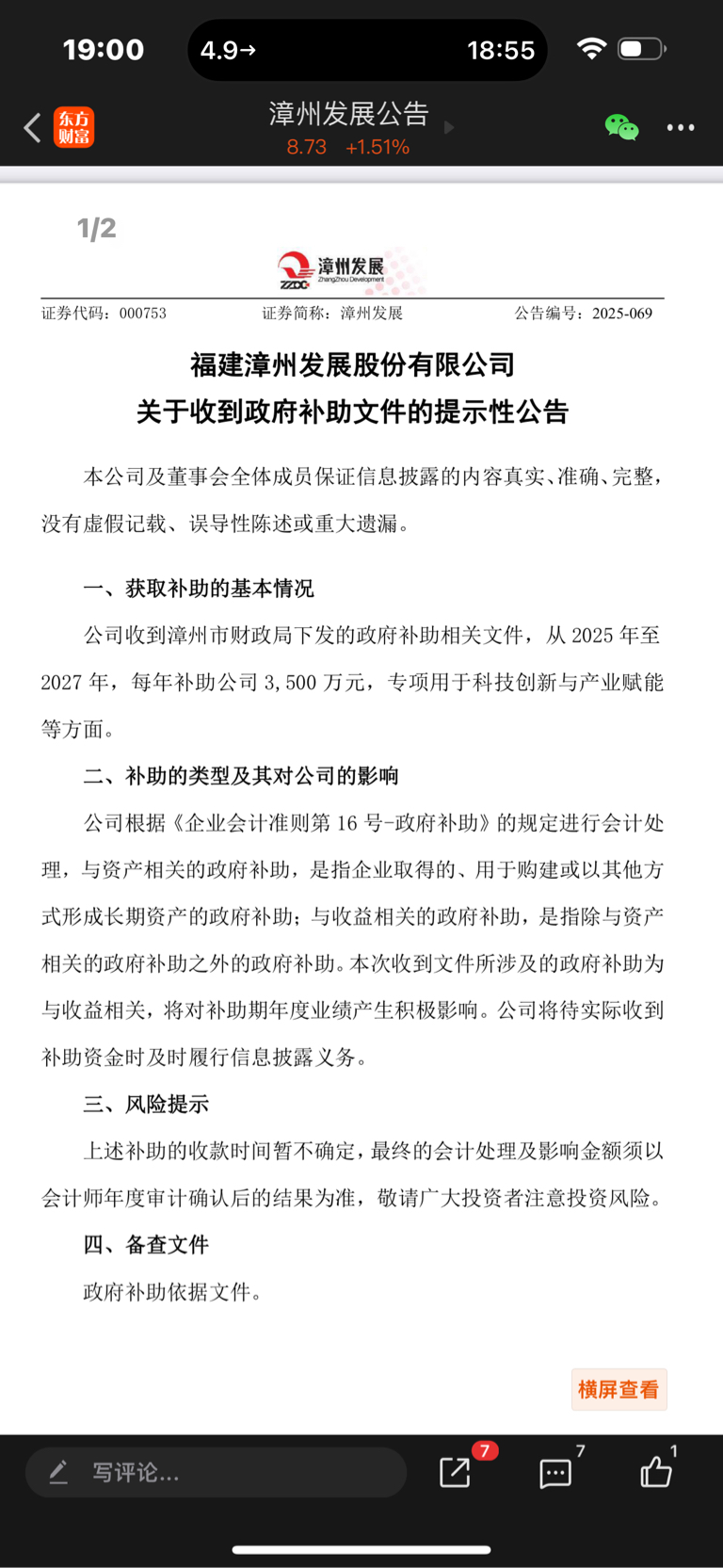 $漳州发展(SZ000753)$ 大利好呀。哭漳州发展。一年估计赚到手的钱都没有3500万。(现金,欠账除外)这次政府直接给补贴3500万,用于科技创新,产业赋能等。牛逼了。