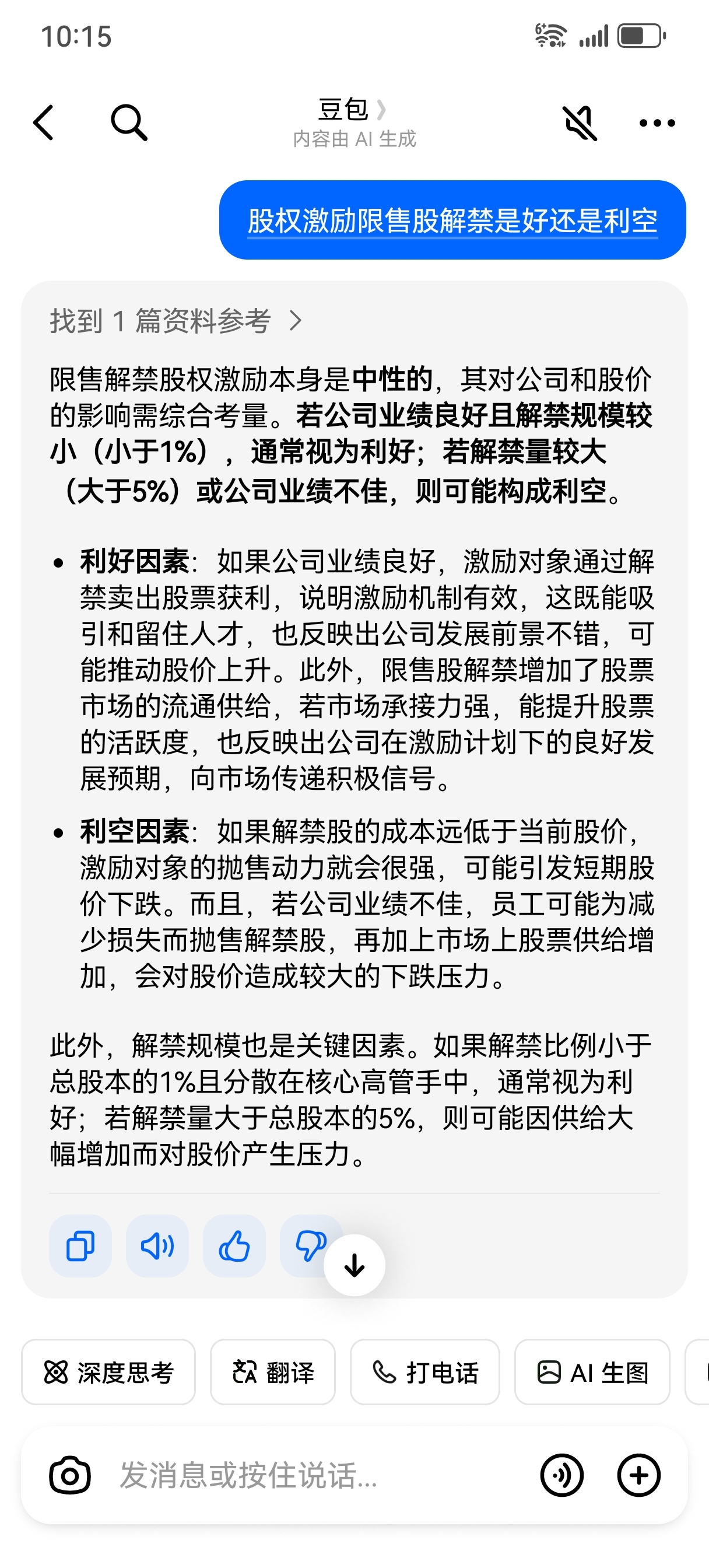豆包认为业绩好的公司股权激励小于1%股票解禁上市,是利好!