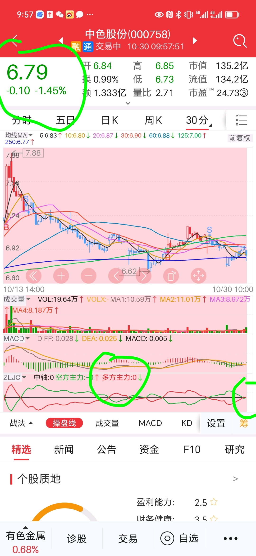 $中色股份(SZ000758)$ 目前跌1.5附近,多空线多方已经从昨天最后半小时的正转向到了0。就是我开盘前说的若跌1.5。假如后面半小时饭一小时不能反弹,多方就是负值,散户着急什么。等多方变成正,你观察一小时看有没有继续大幅往下再买不迟呀。多也不是我随便说多,说它弱比较就是了,多方跑散户没必要去堵抢眼。9:58截图。