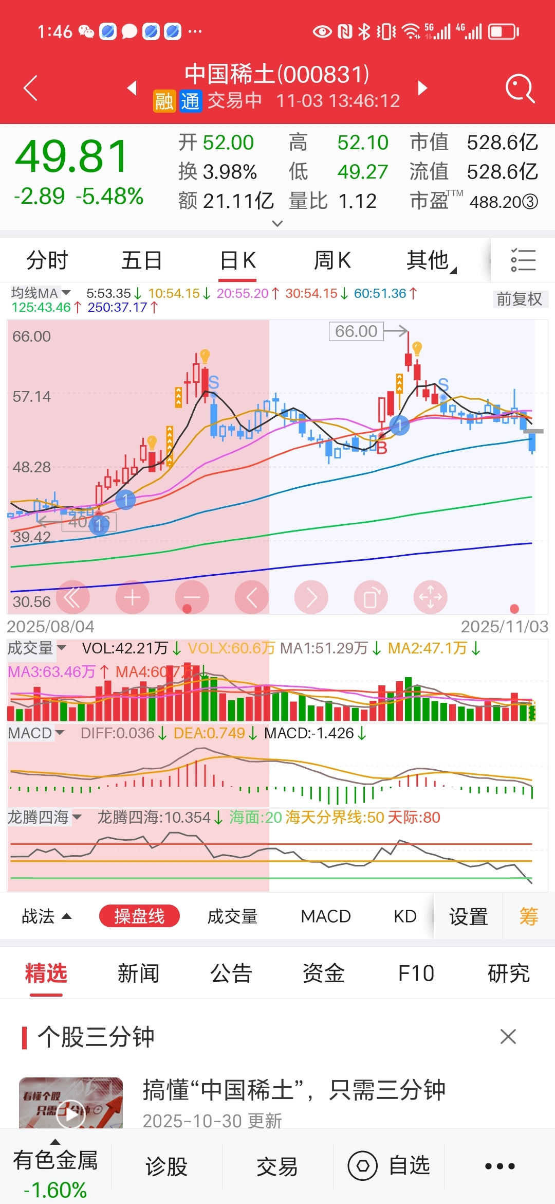 稀土几天跌了25%,它涨的时候中色不怎么长,它往下回调中色必跟