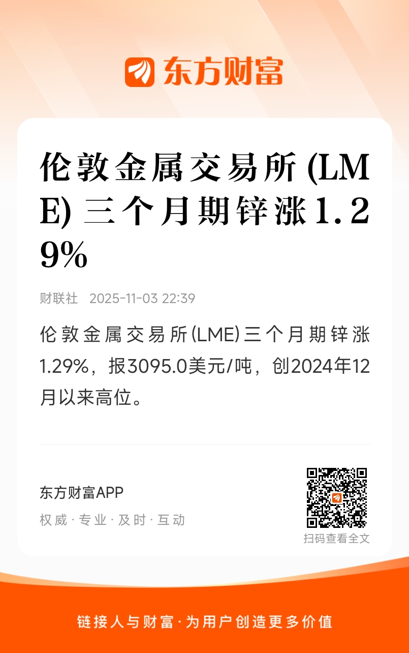 伦敦金属交易所(LME)三个月期锌涨1.29%,报3095.0美元/吨,创2024年12月以来高位。