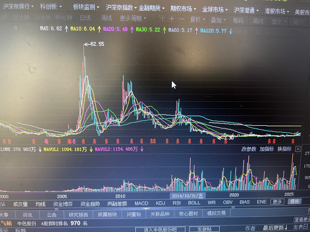 为什么电脑看中色股份历史最高62元手机看只有18元
