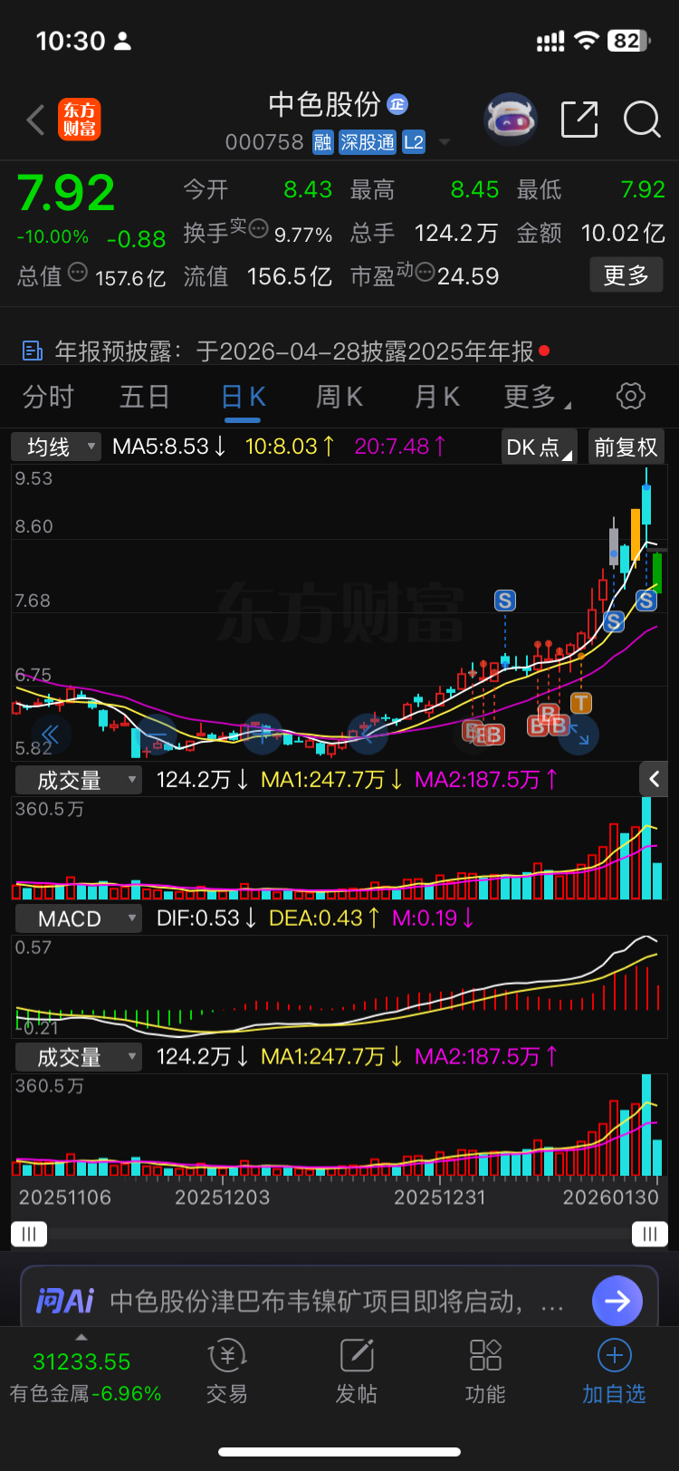 $中色股份(SZ000758)$ 跌了就赶紧,不要等亏钱外跑