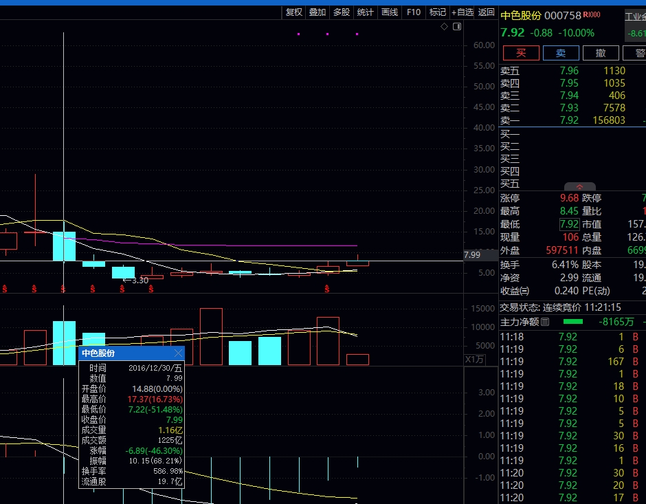 $中色股份(SZ000758)$ 今天各位恐慌了吗?这样暴力洗盘会洗出很多人,如果受不了市场波动对你的影响,那就把账号关了,软件删除,可能三月最后一个交易日它的股价还会在7.9附近,但是未来呢,想想六月底它会不会经历到16.17附近呢?这张是季K线。看懂的话想必你现在已经心安理得的会意一笑,心情也好过些,今天下跌只是上涨途中的一次波动,不要因此改变你投资它的信心和初心。