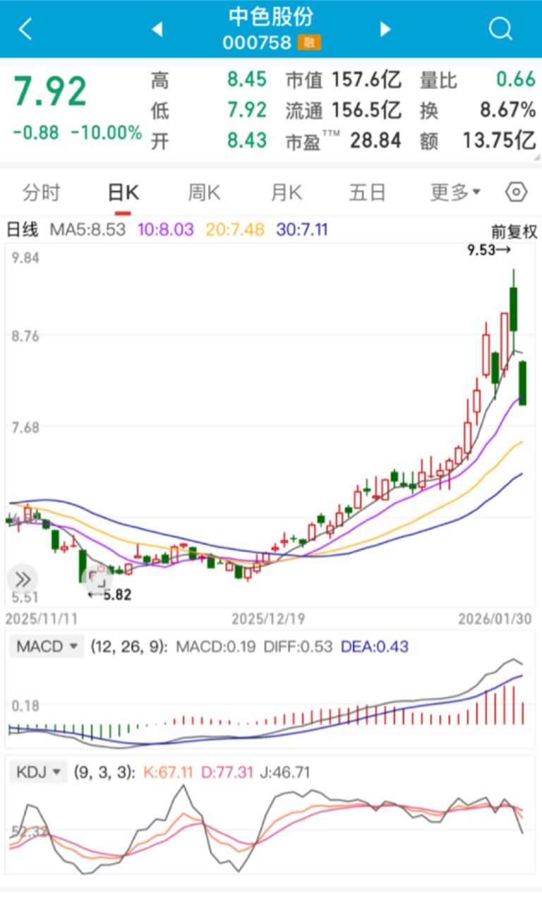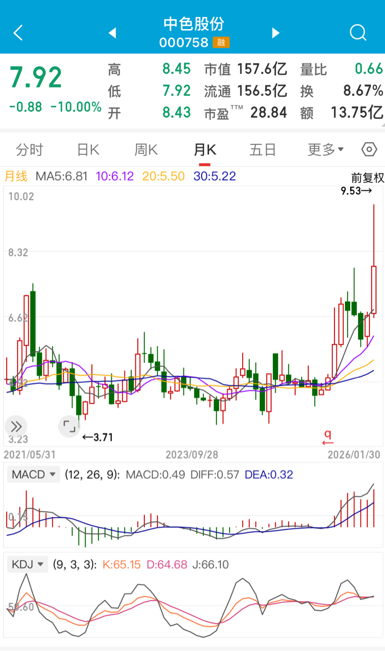 $中色股份(SZ000758)$ 经过这次滑铁卢,我发现好多股友都是凭感觉和看消息选股,我也一样,纯小白一个。从今以后静下心来学习看K线,Macd。请高手看一下这票K线,我觉得月线还是看涨,只是日线周线短期跌,对吗?。上图中黑色是5日线,紫色10日线,黄色20日线对吗?头一次学k线,请同志们教一下吧