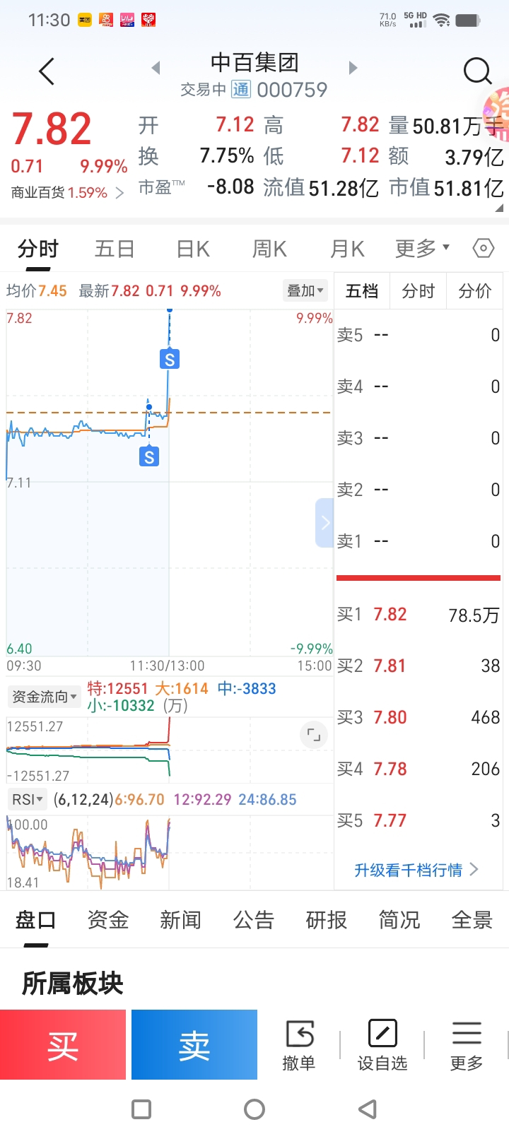 $中百集团(SZ000759)$ 气晕了买了20万,7.44卖了一半。成本7.36