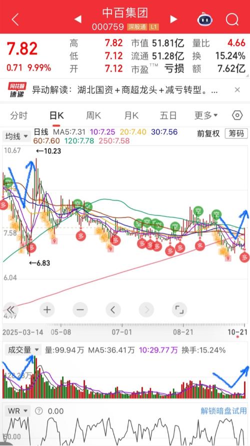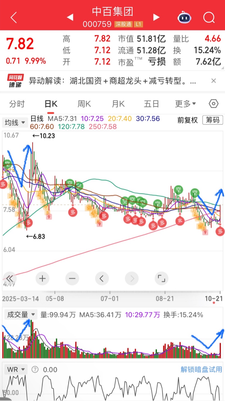$中百集团(SZ000759)$ 4.7关税后消费、农业暴涨,中百4个板从6.9涨到10.3,将近50个点的涨幅,4月关税战的大涨前走势也是和9月下旬这一波跌势一样阴跌。