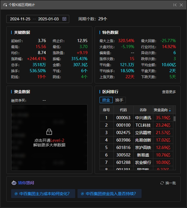 年底是消费大爆发的时间段,去年十一月底到一月初,中百29天15个涨停板,看看今年