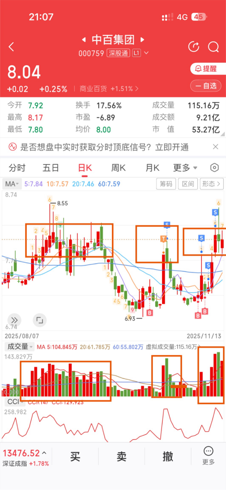 个人认为短期中百不适合继续操作,主要是量能都是较大的,不排除换庄的可能性,但是我个人更多的认为是庄家在冲高过程中发现上方压力较大,对导或者拉高出货。